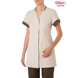 Casacca da donna a maniche corte colore Avana con inserti marroni.