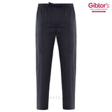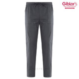 Pantalone dalla vestibilità regular e taglio trendy, realizzato in elegante tessuto gessato dalla mano morbida e resistente al candeggio. Fascione con coulisse, due tasche sui fianchi e piccola tasca posteriore, con la classica etichetta tessuta Giblor’s.