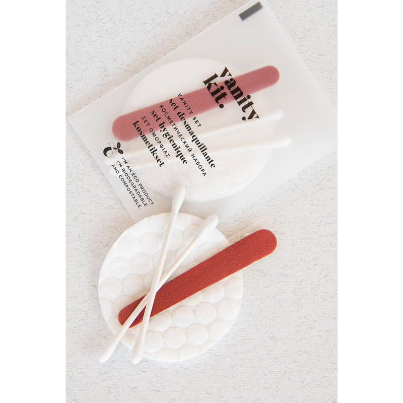 Set cosmetico biodegradabile e compostabile in Eco flowpack 100% riciclabile. Un complemento dal design minimal e dall'aspetto naturale che ben si adatta a diverse tipologie di strutture in abbinamento alla classica linea cortesia.