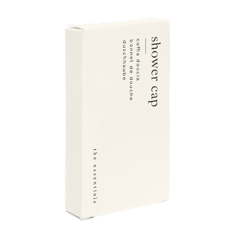 Cuffia doccia in astuccio di carta color crema 100% riciclabile. Un complemento dal design minimal che ben si adatta a diverse tipologie di strutture in abbinamento alla classica linea cortesia.