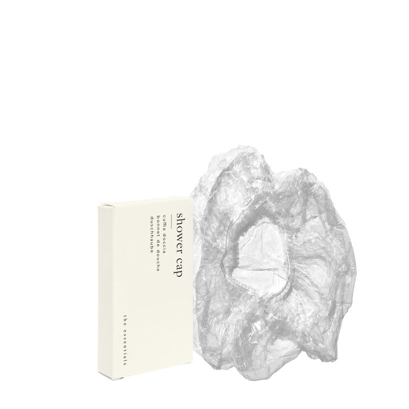 Cuffia doccia in astuccio di carta color crema 100% riciclabile.